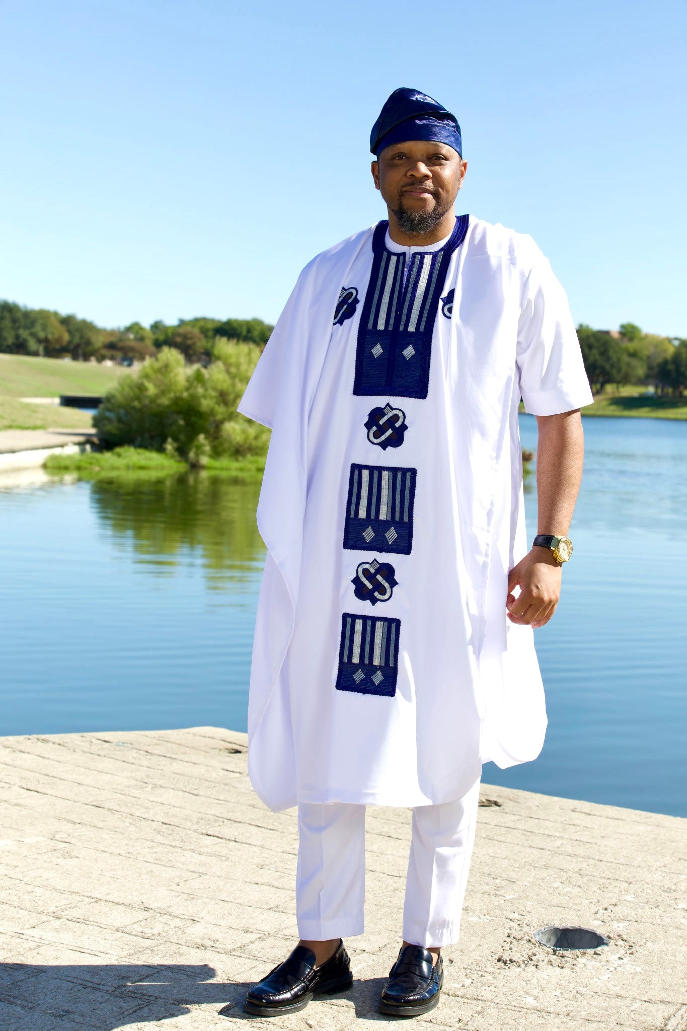 The flowing white Agbada features refined blue embroidery delicately detailed across the front, adding depth, contrast, and a clean, classy aesthetic. The embroidery is thoughtfully designed to enhance the garment without overpowering its minimalist elegance.